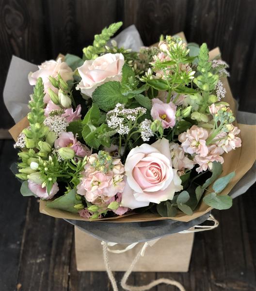 This hand tied bouquet is a perfect mix of pastel pinks, subtly arranged to create a very special kind of beauty - definitely one of our favourites!