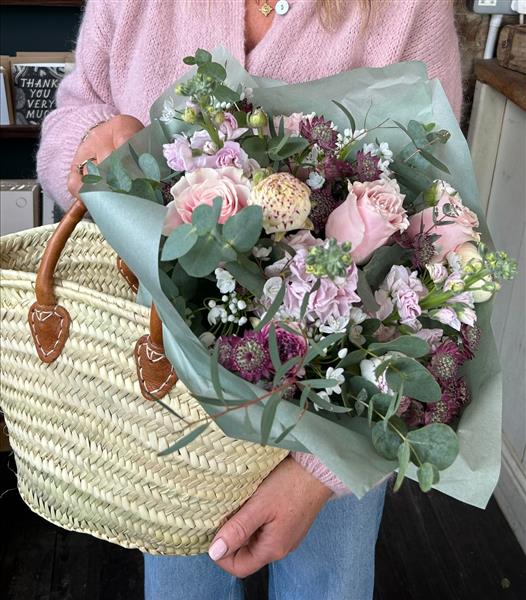 A beautiful twist on a classic bouquet. Our Bouquet in a Basket features a gorgeous hand-tied arrangement presented inside a charming mini French market tote – the perfect gift that lasts beyond the flowers.