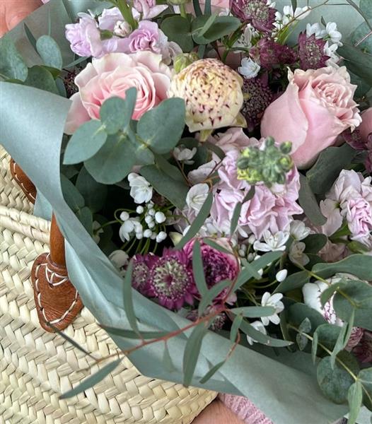 The bag is handwoven from durable natural palm leaf straw and finished with rolled brown leather handles for an effortless, rustic feel. Inside, you’ll find a hand tied seasonal bouquet, ready to gift and easy to carry.