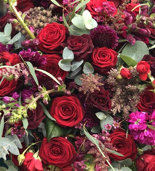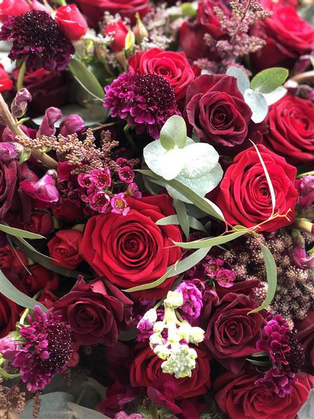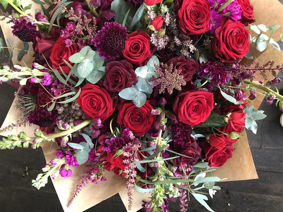 This absolutely stunning bouquet is just bursting with romance. Beautiful red velvety roses, scented stocks, antirrhinums, scabious, waxflowers and astrantia stylishly arranged amongst gorgeous foliages. It really is the ultimate romantic gesture. ❤️