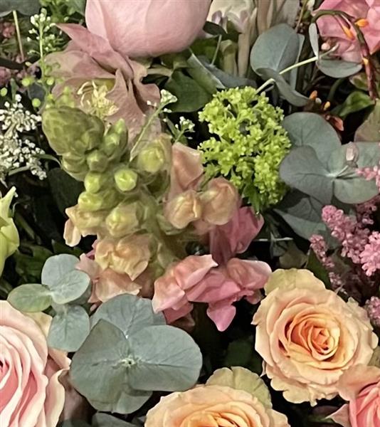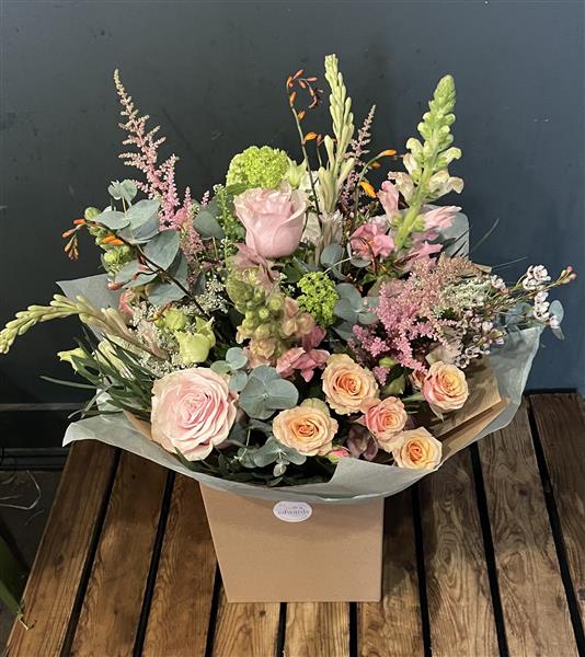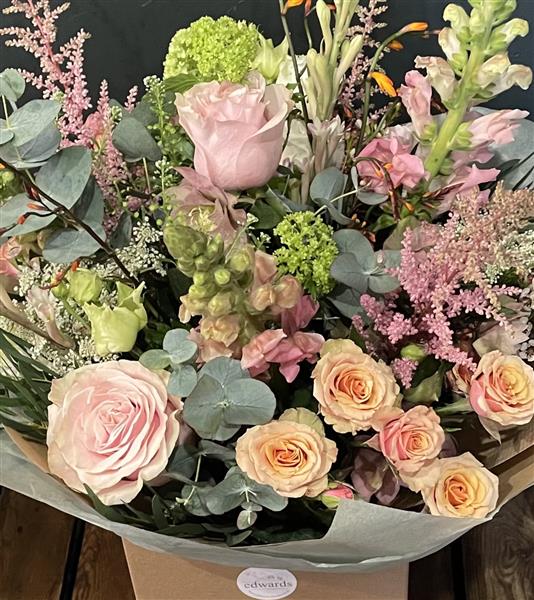 A pretty and vibrant hand tied bouquet in blush, pinks, peach and oranges. Roses, spray roses, antirrhinum, astilbe, guelder rose, tuberose, lisianthus and ammi, nestled amongst scented mixed eucalyptus. A perfect gift for your lovely Mum this Mothers Day.💕