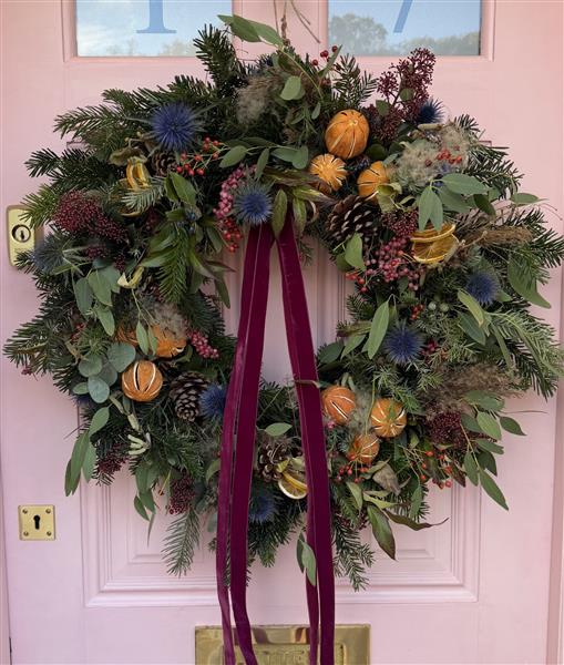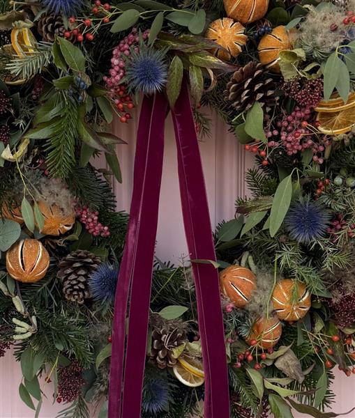Abundant, festive and full of seasonal warmth, the Luxury wreath is designed to make a statement. Overflowing with fragrant evergreens, vibrant thistles, dried oranges, pinecones, berries and eucalyptus, it blends colour and texture beautifully for a rich, luxurious finish. A deep velvet ribbon adds the perfect final flourish.