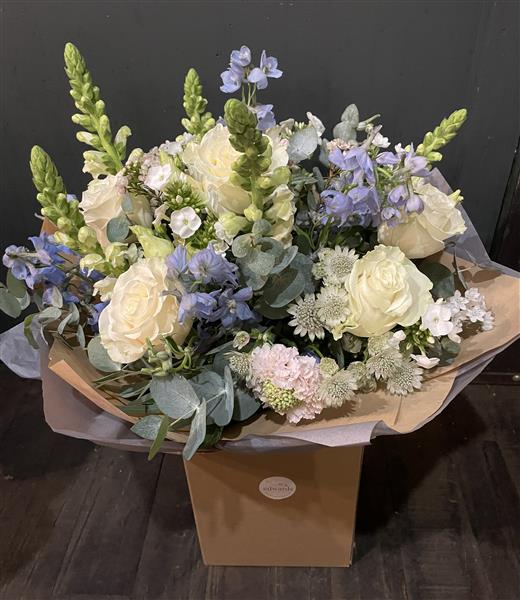 A beautiful hand tied bouquet in creams , pale blues and blush. Cream roses, pale blue delphinium, cream antirrhinums, white phlox, blush scabiosa, arranged amongst scented eucalyptus and white astrantia. The perfect gift for your lovely Mum this Mothers Day. 💕