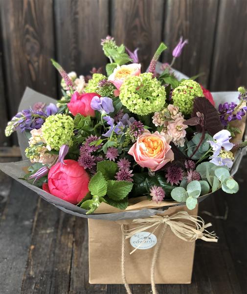This brightly coloured bouquet looks like it’s just been picked from a beauty English country garden- garden styled roses, scented foliages, vibrant greens, purples, lilacs and shades of pink give it a classic, delightful and summery feel.
