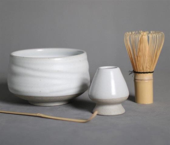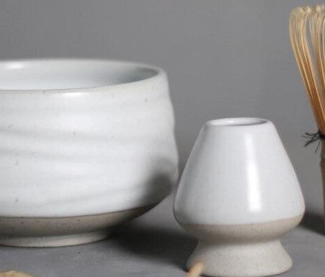Beautiful ceramic handmade set from Gohobi, containing a bowl, bamboo whisk, whisk holder and spoon.