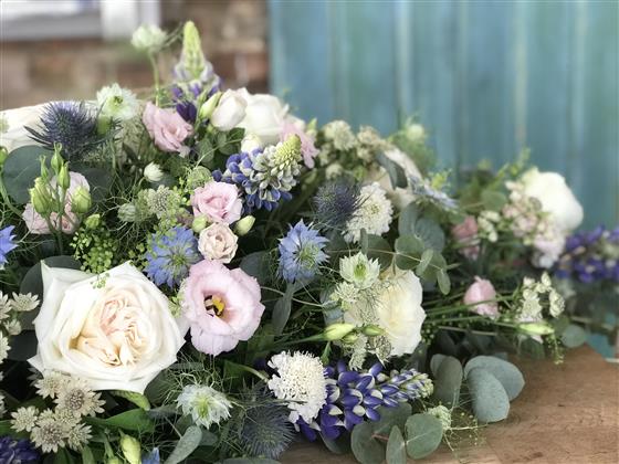 Casket spray in beautiful bright hues. These sprays tend to be the main tribute and adorn the top of the casket. These are beautiful natural styled arrangements and are available in various different colours or you are able to leave the flower choice to us and we will ensure we use the very best seasonal flowers. We can also add any personal touches, if you wish to ensure the flowers reflect your loved one perfectly. They are available in 3 different sizes 3ft, 4ft and 5ft.