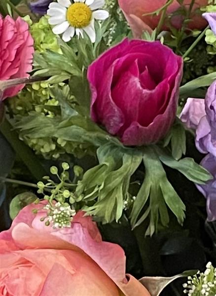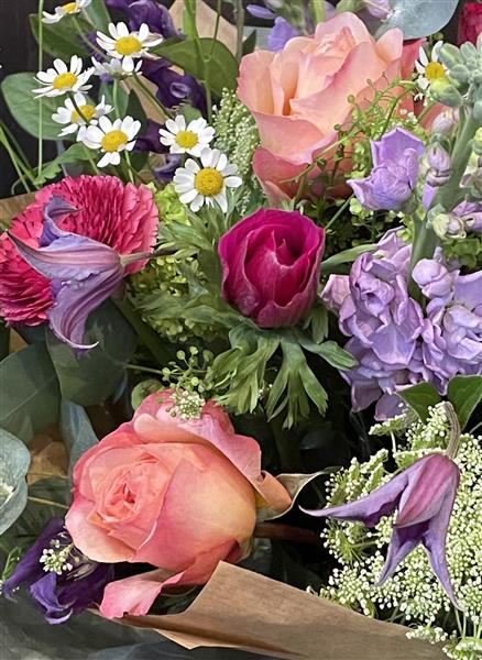 This bright and cheerful hand tied bouquet is bursting with spring flowers, including roses, ranunculus, scented stocks, camomile and anenomes, all nestled amongst scented eucalyptus and other mixed foliages. A perfect gift for your lovely Mum this Mothers Day.