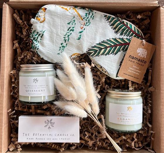 The set also includes a soft Namaste jungle print eye mask, Botanical Company matches, and a delicate mini bunch of bunny tail dried flowers.