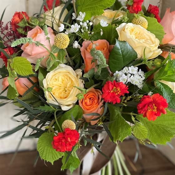 Vibrant and joyful, bursting with seasonal blooms in rich coral, sunny yellows, and bold pinks. Perfect for couples wanting a celebration of colour that captures the warmth and energy of the season.