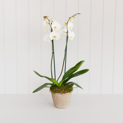 Beautiful and a timeless classic, this double stemmed white orchid is planted in a rustic terracotta planter.